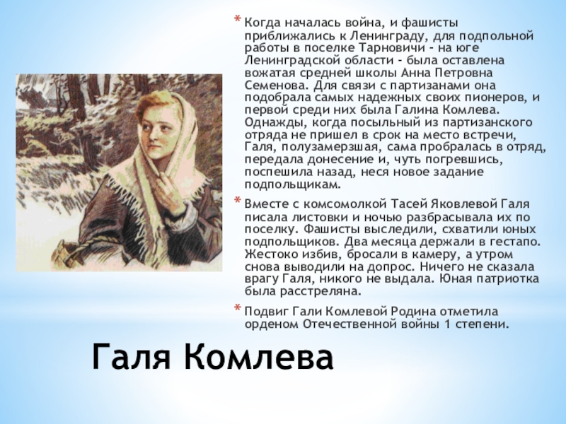 работы в поселке Тарновичи - на юге Ленинградской области - была оставлена вожатая средней школы Анна Петровна Семенова. Для связи с партизанами она подобрала самых надежных своих пионеров, и первой среди них была Галина Комлева. Однажды, когда посыльный из партизанского отряда не пришел в срок на место встречи, Галя, полузамерзшая, сама пробралась в отряд, передала донесение и, чуть погревшись, поспешила назад, неся новое задание подпольщикам.