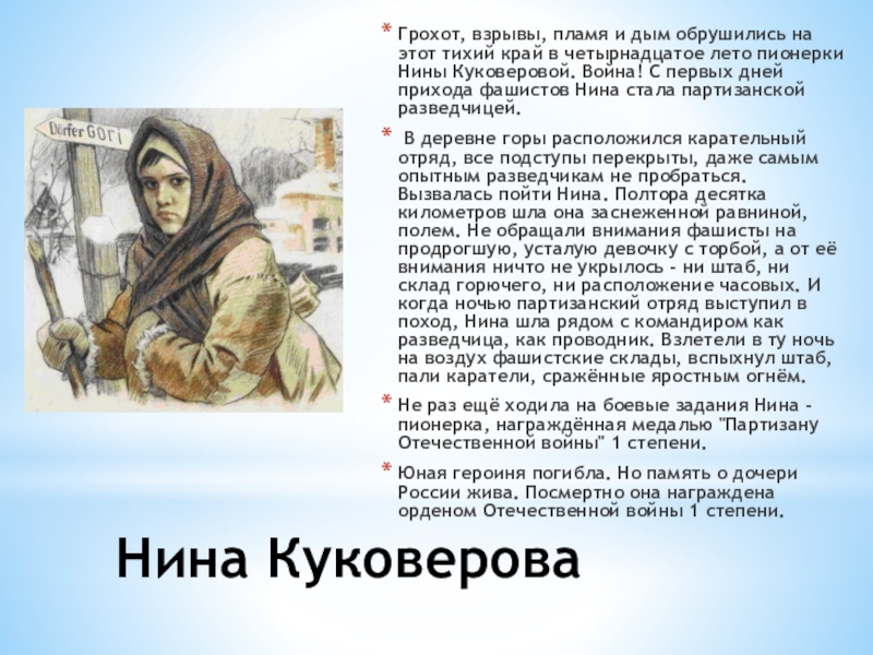 В деревне горы расположился карательный отряд, все подступы перекрыты, даже самым опытным разведчикам не пробраться. Вызвалась пойти Нина. Полтора десятка километров шла она заснеженной равниной, полем. Не обращали внимания фашисты на продрогшую, усталую девочку с торбой, а от её внимания ничто не укрылось - ни штаб, ни склад горючего, ни расположение часовых. И когда ночью партизанский отряд выступил в поход, Нина шла рядом с командиром как разведчица, как проводник. Взлетели в ту ночь на воздух фашистские склады, вспыхнул штаб, пали каратели, сражённые яростным огнём.