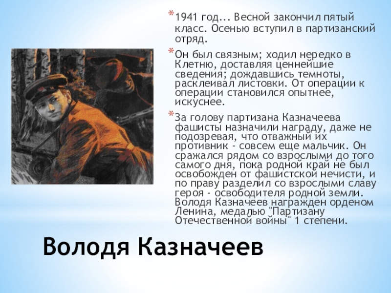 За голову партизана Казначеева фашисты назначили награду, даже не подозревая, что отважный их противник - совсем еще мальчик. Он сражался рядом со взрослыми до того самого дня, пока родной край не был освобожден от фашистской нечисти, и по праву разделил со взрослыми славу героя - освободителя родной земли. Володя Казначеев награжден орденом Ленина, медалью "Партизану Отечественной войны" 1 степени.