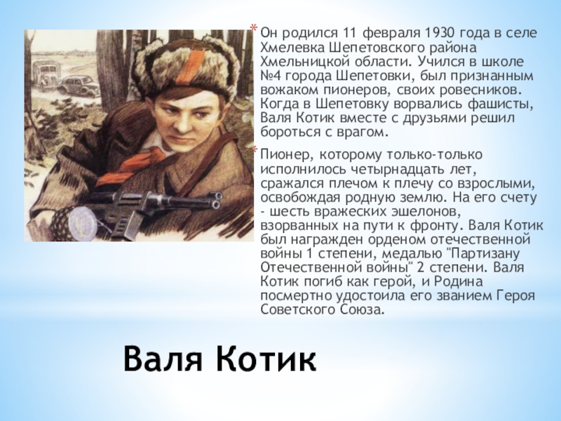 Пионер, которому только-только исполнилось четырнадцать лет, сражался плечом к плечу со взрослыми, освобождая родную землю. На его счету - шесть вражеских эшелонов, взорванных на пути к фронту. Валя Котик был награжден орденом отечественной войны 1 степени, медалью "Партизану Отечественной войны" 2 степени. Валя Котик погиб как герой, и Родина посмертно удостоила его званием Героя Советского Союза.