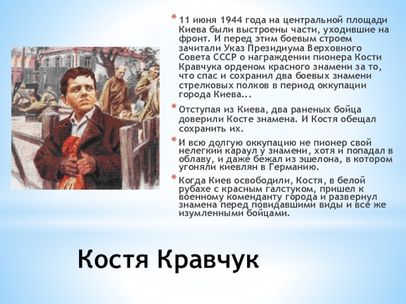 части, уходившие на фронт. И перед этим боевым строем зачитали Указ Президиума Верховного Совета СССР о награждении пионера Кости Кравчука орденом красного знамени за то, что спас и сохранил два боевых знамени стрелковых полков в период оккупации города Киева...