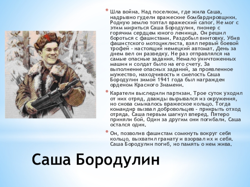 бомбардировщики. Родную землю топтал вражеский сапог. Не мог с этим мириться Саша Бородулин, пионер с горячим сердцем юного ленинца. Он решил бороться с фашистами. Раздобыл винтовку. Убив фашистского мотоциклиста, взял первый боевой трофей - настоящий немецкий автомат. День за днем вел он разведку. Не раз отправлялся на самые опасные задания. Немало уничтоженных машин и солдат было на его счету. За выполнение опасных заданий, за проявленное мужество, находчивость и смелость Саша Бородулин зимой 1941 года был награжден орденом Красного Знамени.