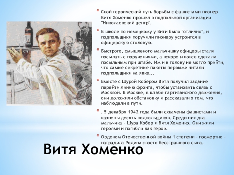 Свой героический путь борьбы с фашистами пионер Витя Хоменко прошел