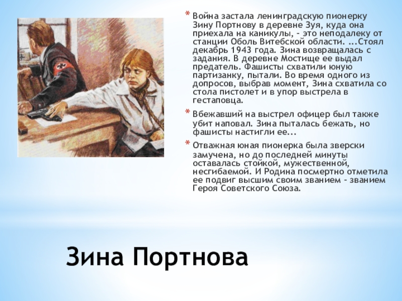 Война застала ленинградскую пионерку Зину Портнову в деревне Зуя, куда
