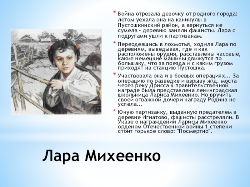 Юную партизанку, выданную предателем в деревне Игнатово, фашисты расстреляли. В Указе о награждении Ларисы Михеенко орденом Отечественной войны 1 степени стоит горькое слово: "Посмертно".