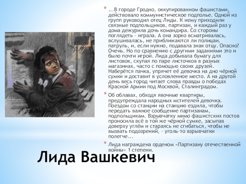 групп руководил отец Лиды. К нему приходили связные подпольщиков, партизан, и каждый раз у дома дежурила дочь командира. Со стороны поглядеть - играла. А она зорко всматривалась, вслушивалась, не приближаются ли полицаи, патруль, и, если нужно, подавала знак отцу. Опасно? Очень. Но по сравнению с другими заданиями это и было почти игрой. Лида добывала бумагу для листовок, скупая по паре листочков в разных магазинах, часто с помощью своих друзей. Наберётся пачка, упрячет её девочка на дно чёрной сумки и доставит в условленное место. А на другой день весь город читает слова правды о победах Красной Армии под Москвой, Сталинградом.