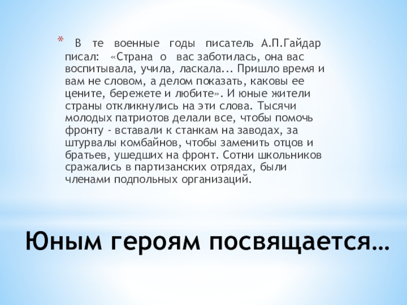 писатель А.П.Гайдар писал: «Страна о вас заботилась, она вас воспитывала, учила, ласкала... Пришло время и вам не словом, а делом показать, каковы ее цените, бережете и любите». И юные жители страны откликнулись на эти слова. Тысячи молодых патриотов делали все, чтобы помочь фронту - вставали к станкам на заводах, за штурвалы комбайнов, чтобы заменить отцов и братьев, ушедших на фронт. Сотни школьников сражались в партизанских отрядах, были членами подпольных организаций.