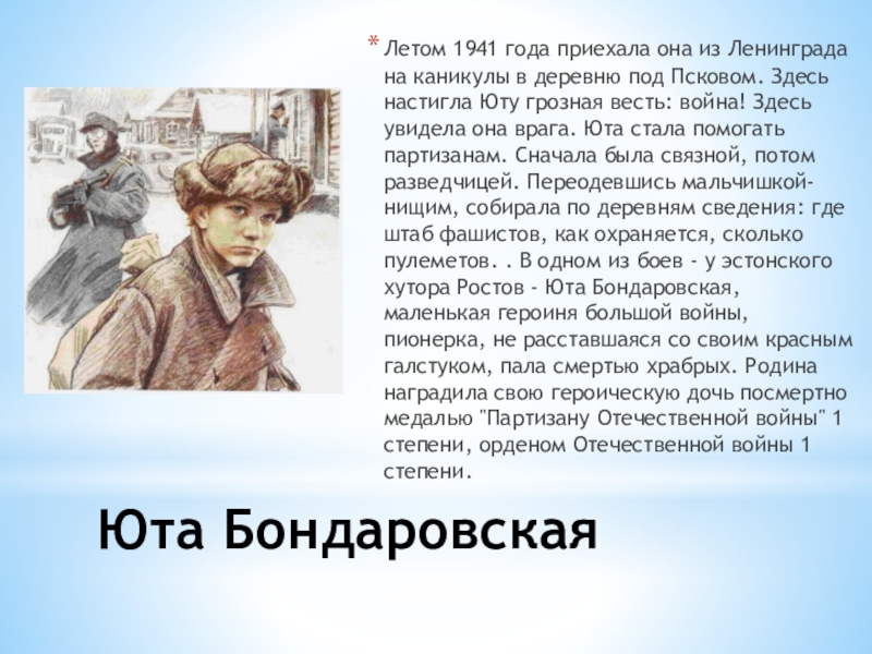 деревню под Псковом. Здесь настигла Юту грозная весть: война! Здесь увидела она врага. Юта стала помогать партизанам. Сначала была связной, потом разведчицей. Переодевшись мальчишкой-нищим, собирала по деревням сведения: где штаб фашистов, как охраняется, сколько пулеметов. . В одном из боев - у эстонского хутора Ростов - Юта Бондаровская, маленькая героиня большой войны, пионерка, не расставшаяся со своим красным галстуком, пала смертью храбрых. Родина наградила свою героическую дочь посмертно медалью "Партизану Отечественной войны" 1 степени, орденом Отечественной войны 1 степени.
