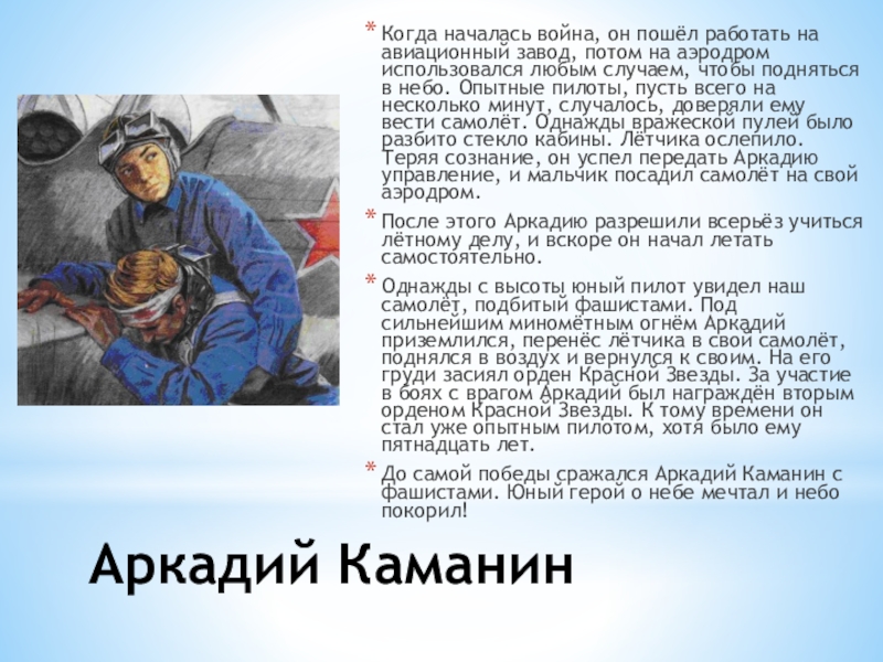 До самой победы сражался Аркадий Каманин с фашистами. Юный герой о небе мечтал и небо покорил!