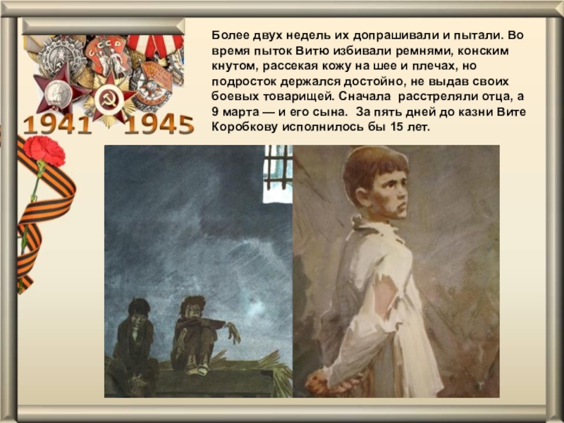Более двух недель их допрашивали и пытали. Во время пыток Витю избивали ремнями, конским кнутом, рассекая кожу на шее и плечах, но подросток держался достойно, не выдав своих боевых товарищей. Сначала расстреляли отца, а 9 марта — и его сына. За пять дней до казни Вите Коробкову исполнилось бы 15 лет.