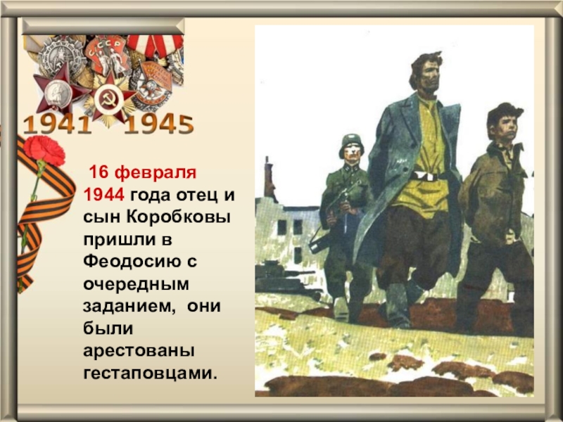 16 февраля 1944 года отец и сын Коробковы пришли в Феодосию с очередным заданием, они были арестованы гестаповцами.