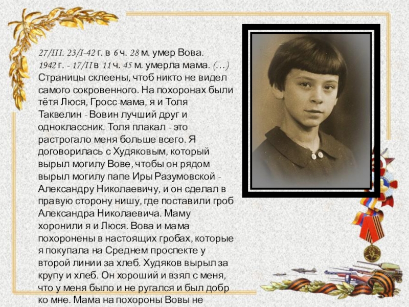 г. - 17/II в 11 ч. 45 м. умерла мама. (…) Страницы склеены, чтоб никто не видел самого сокровенного. На похоронах были тётя Люся, Гросс-мама, я и Толя Таквелин - Вовин лучший друг и одноклассник. Толя плакал - это растрогало меня больше всего. Я договорилась с Худяковым, который вырыл могилу Вове, чтобы он рядом вырыл могилу папе Иры Разумовской - Александру Николаевичу, и он сделал в правую сторону нишу, где поставили гроб Александра Николаевича. Маму хоронили я и Люся. Вова и мама похоронены в настоящих гробах, которые я покупала на Среднем проспекте у второй линии за хлеб. Худяков вырыл за крупу и хлеб. Он хороший и взял с меня, что у меня было и не ругался и был добр ко мне. Мама на похороны Вовы не ходила - у неё уже не было сил.