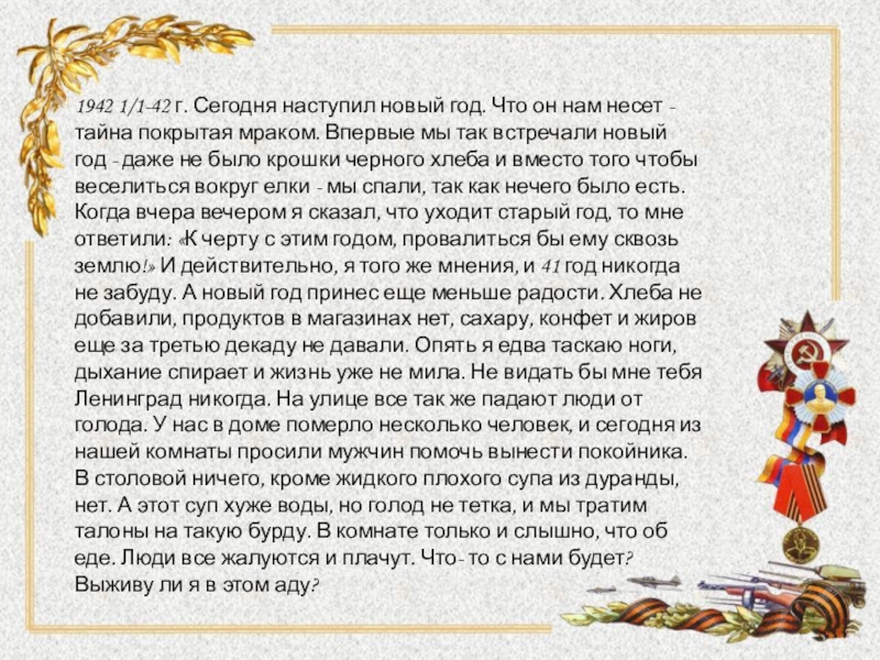 - тайна покрытая мраком. Впервые мы так встречали новый год - даже не было крошки черного хлеба и вместо того чтобы веселиться вокруг елки - мы спали, так как нечего было есть. Когда вчера вечером я сказал, что уходит старый год, то мне ответили: «К черту с этим годом, провалиться бы ему сквозь землю!» И действительно, я того же мнения, и 41 год никогда не забуду. А новый год принес еще меньше радости. Хлеба не добавили, продуктов в магазинах нет, сахару, конфет и жиров еще за третью декаду не давали. Опять я едва таскаю ноги, дыхание спирает и жизнь уже не мила. Не видать бы мне тебя Ленинград никогда. На улице все так же падают люди от голода. У нас в доме померло несколько человек, и сегодня из нашей комнаты просили мужчин помочь вынести покойника. В столовой ничего, кроме жидкого плохого супа из дуранды, нет. А этот суп хуже воды, но голод не тетка, и мы тратим талоны на такую бурду. В комнате только и слышно, что об еде. Люди все жалуются и плачут. Что- то с нами будет? Выживу ли я в этом аду?