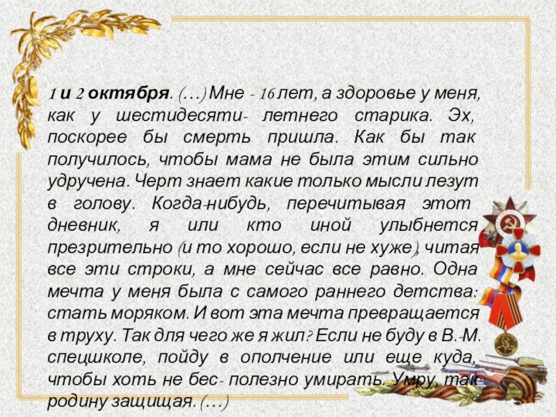 Слайд 61 и 2 октября. (…) Мне - 16 лет, а здоровье