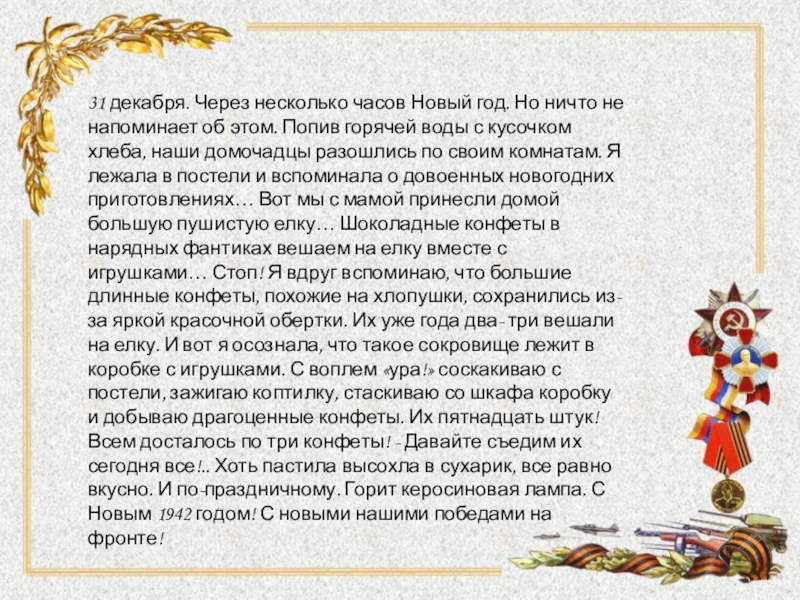 об этом. Попив горячей воды с кусочком хлеба, наши домочадцы разошлись по своим комнатам. Я лежала в постели и вспоминала о довоенных новогодних приготовлениях… Вот мы с мамой принесли домой большую пушистую елку… Шоколадные конфеты в нарядных фантиках вешаем на елку вместе с игрушками… Стоп! Я вдруг вспоминаю, что большие длинные конфеты, похожие на хлопушки, сохранились из-за яркой красочной обертки. Их уже года два- три вешали на елку. И вот я осознала, что такое сокровище лежит в коробке с игрушками. С воплем «ура!» соскакиваю с постели, зажигаю коптилку, стаскиваю со шкафа коробку и добываю драгоценные конфеты. Их пятнадцать штук! Всем досталось по три конфеты! - Давайте съедим их сегодня все!.. Хоть пастила высохла в сухарик, все равно вкусно. И по-праздничному. Горит керосиновая лампа. С Новым 1942 годом! С новыми нашими победами на фронте!