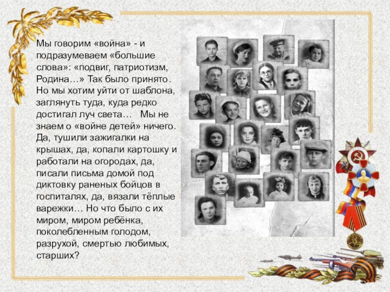 Так было принято. Но мы хотим уйти от шаблона, заглянуть туда, куда редко достигал луч света… Мы не знаем о «войне детей» ничего. Да, тушили зажигалки на крышах, да, копали картошку и работали на огородах, да, писали письма домой под диктовку раненых бойцов в госпиталях, да, вязали тёплые варежки… Но что было с их миром, миром ребёнка, поколебленным голодом, разрухой, смертью любимых, старших?
