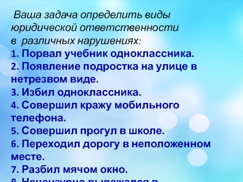 Слайд 9 Ваша задача определить виды юридической ответственности в  различных нарушениях: