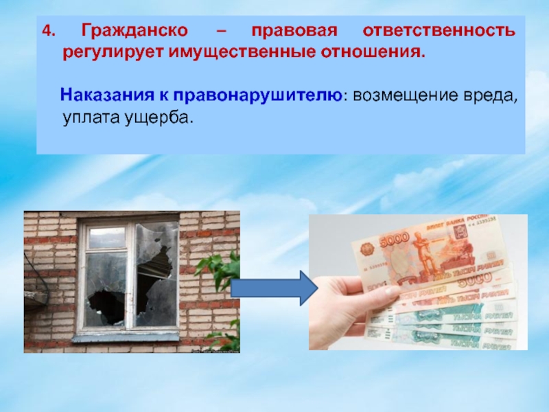 4. Гражданско  – правовая ответственность регулирует имущественные отношения.   Наказания к правонарушителю: возмещение вреда, уплата ущерба.