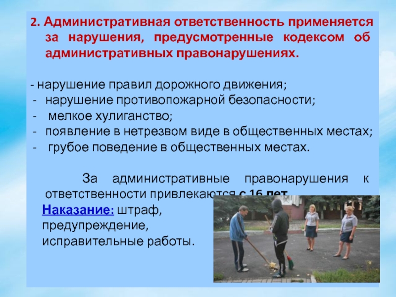 2. Административная ответственность применяется за нарушения, предусмотренные кодексом об административных правонарушениях. - нарушение правил дорожного движения;нарушение противопожарной