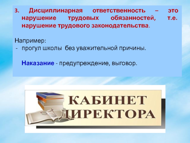 3. Дисциплинарная ответственность – это нарушение трудовых обязанностей, т.е. нарушение трудового законодательства.Например: прогул школы  без уважительной причины.