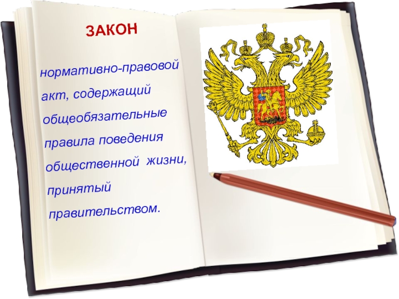 ЗАКОН нормативно-правовой акт, содержащий общеобязательные правила поведения общественной жизни, принятый правительством.