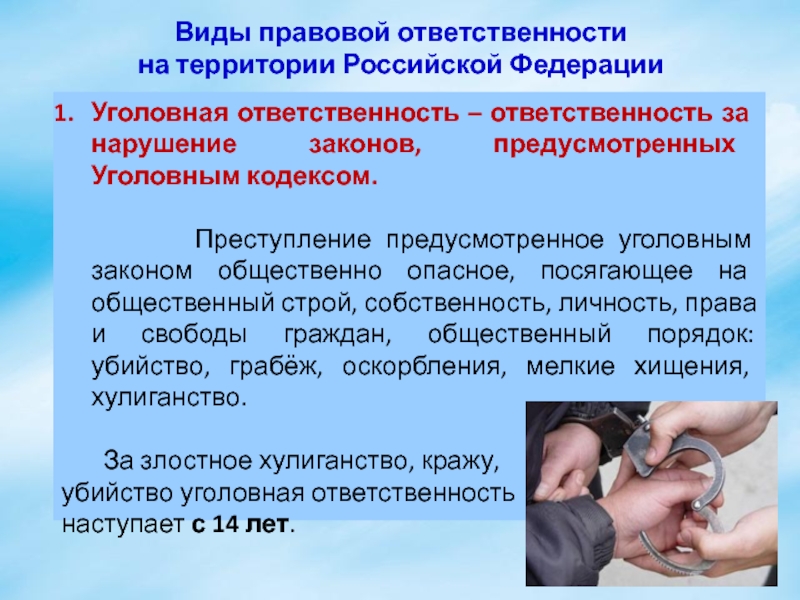 Виды правовой ответственностина территории Российской ФедерацииУголовная ответственность – ответственность за нарушение законов, предусмотренных Уголовным кодексом.