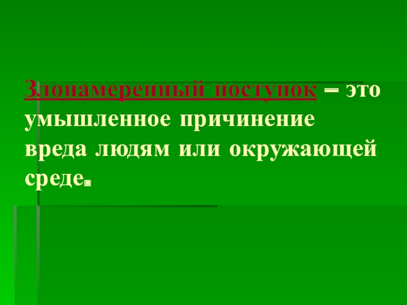 Слайд 9Злонамеренный поступок – это умышленное причинение вреда людям или окружающей среде.
