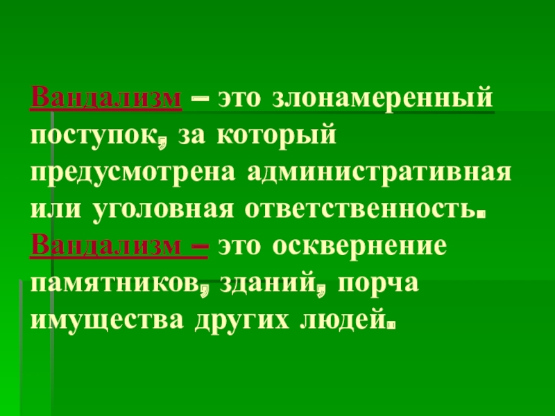 Вандализм – это злонамеренный поступок, за который предусмотрена административная или уголовная ответственность. Вандализм – это осквернение памятников,