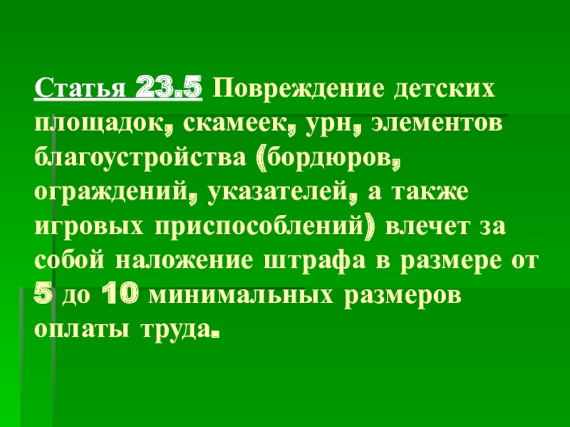 Слайд 23Статья 23.5 Повреждение детских площадок, скамеек, урн, элементов благоустройства (бордюров, ограждений,
