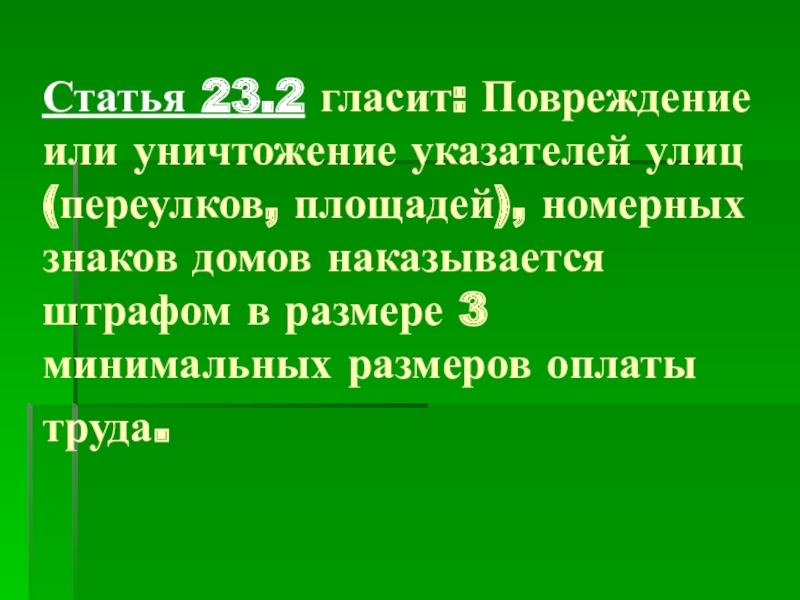 Слайд 24Статья 23.2 гласит: Повреждение или уничтожение указателей улиц (переулков, площадей), номерных
