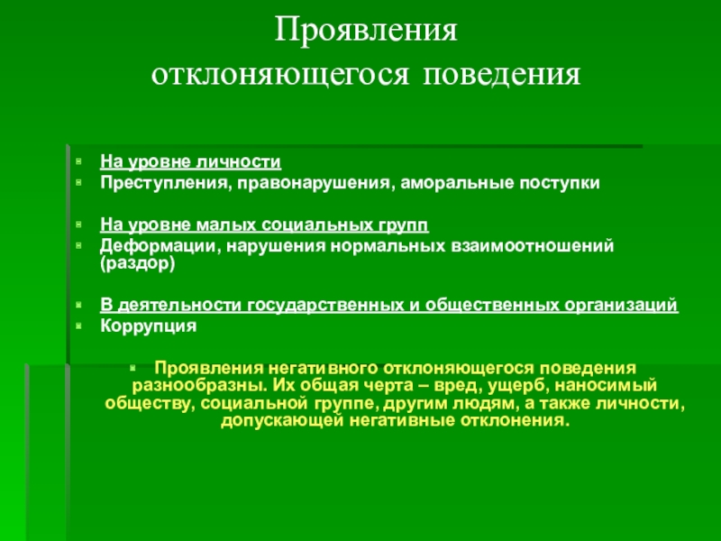 Проявления негативного отклоняющегося поведения разнообразны. Их общая черта – вред, ущерб, наносимый обществу, социальной группе, другим людям, а также личности, допускающей негативные отклонения.