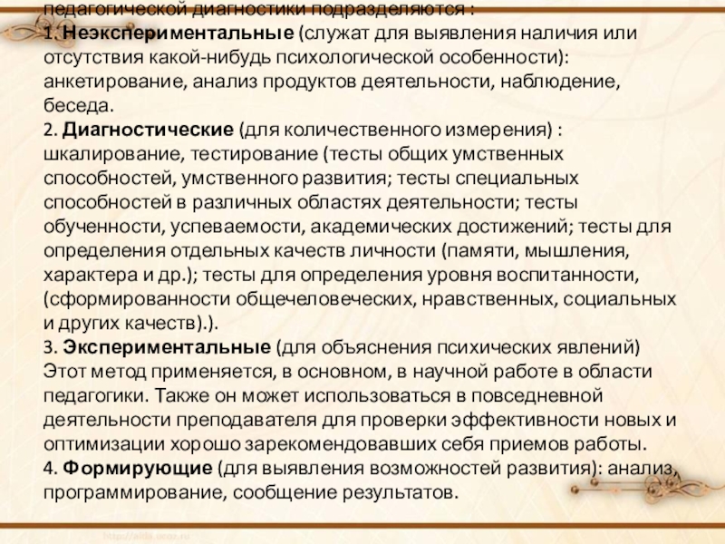 Слайд 10 В зависимости от задач изучения, применяемые методы педагогической диагностики подразделяются