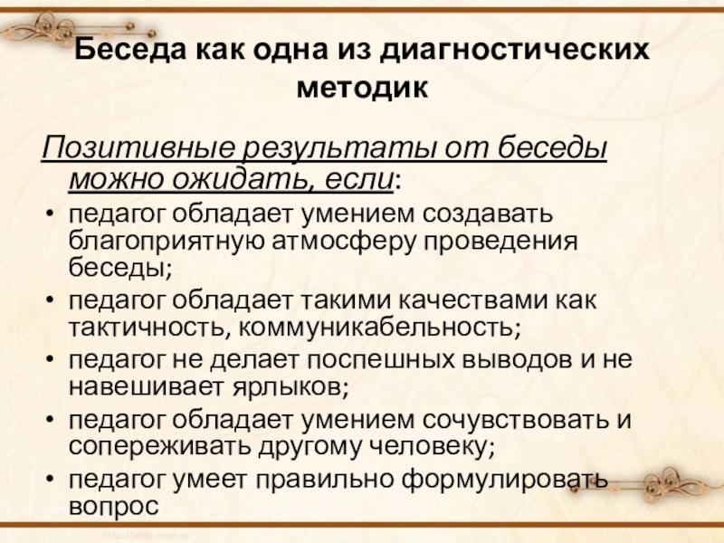 Слайд 11Беседа как одна из диагностических методик