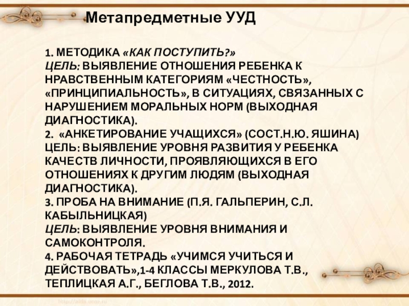 4. РАБОЧАЯ ТЕТРАДЬ «УЧИМСЯ УЧИТЬСЯ И ДЕЙСТВОВАТЬ»,1-4 КЛАССЫ МЕРКУЛОВА Т.В., ТЕПЛИЦКАЯ А.Г., БЕГЛОВА Т.В., 2012.