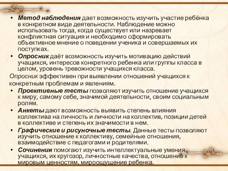 Наблюдение можно использовать тогда, когда существует или назревает конфликтная ситуация и необходимо сформировать объективное мнение о поведении ученика и совершаемых их поступках.