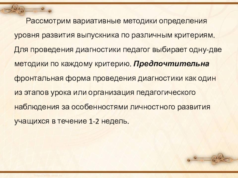 проведения диагностики педагог выбирает одну-две методики по каждому критерию. Предпочтительна фронтальная форма проведения диагностики как один из этапов урока или организация педагогического наблюдения за особенностями личностного развития учащихся в течение 1-2 недель.
