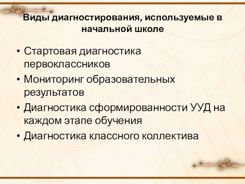 Слайд 7Виды диагностирования, используемые в начальной школе