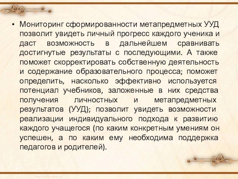 Мониторинг сформированности метапредметных УУД позволит увидеть личный прогресс каждого ученика и