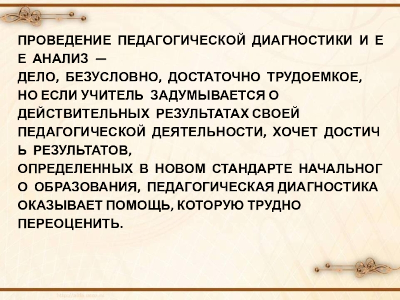 ОПРЕДЕЛЕННЫХ В НОВОМ СТАНДАРТЕ НАЧАЛЬНОГО ОБРАЗОВАНИЯ, ПЕДАГОГИЧЕСКАЯ ДИАГНОСТИКА ОКАЗЫВАЕТ ПОМОЩЬ, КОТОРУЮ ТРУДНО ПЕРЕОЦЕНИТЬ.