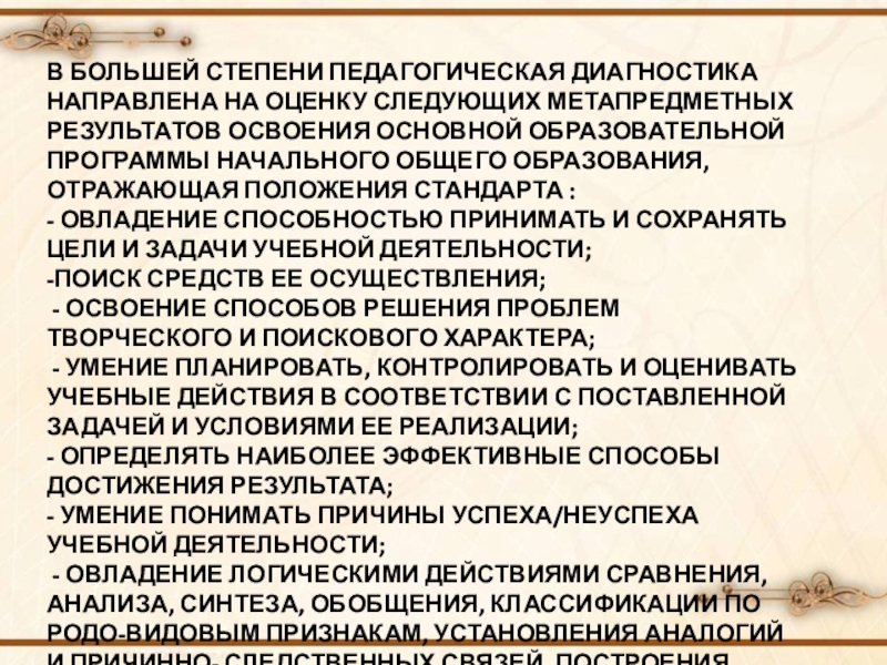 Слайд 8В БОЛЬШЕЙ СТЕПЕНИ ПЕДАГОГИЧЕСКАЯ ДИАГНОСТИКА НАПРАВЛЕНА НА ОЦЕНКУ СЛЕДУЮЩИХ МЕТАПРЕДМЕТНЫХ РЕЗУЛЬТАТОВ