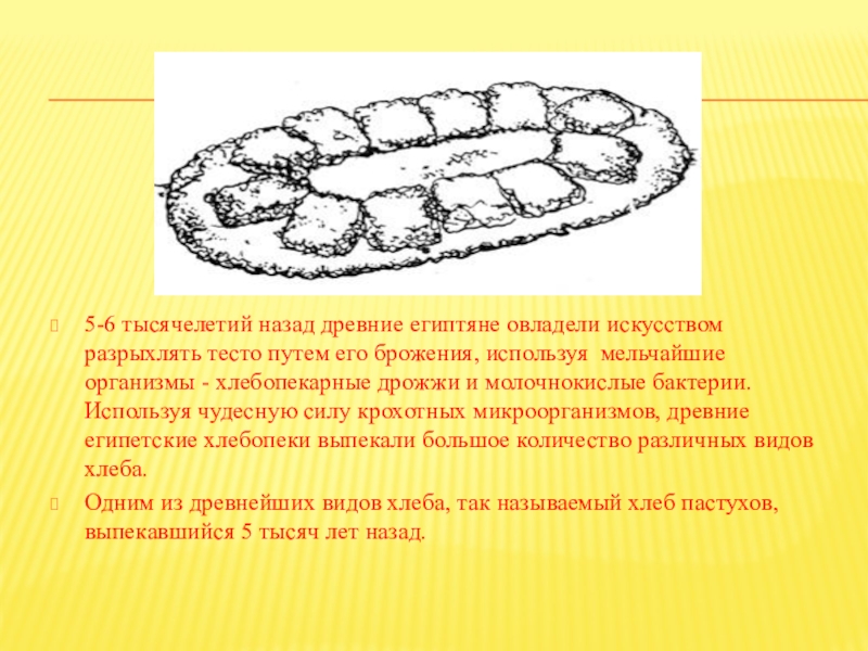 5-6 тысячелетий назад древние египтяне овладели искусством разрыхлять тесто путем его брожения, используя мельчайшие организмы - хлебопекарные