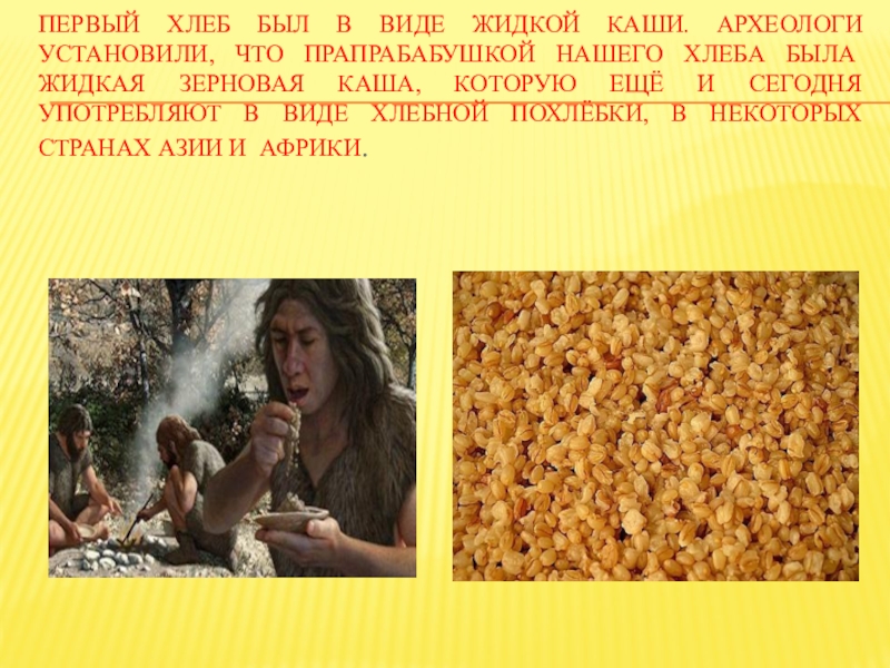 Слайд 8Первый хлеб был в виде жидкой каши. Археологи установили, что прапрабабушкой