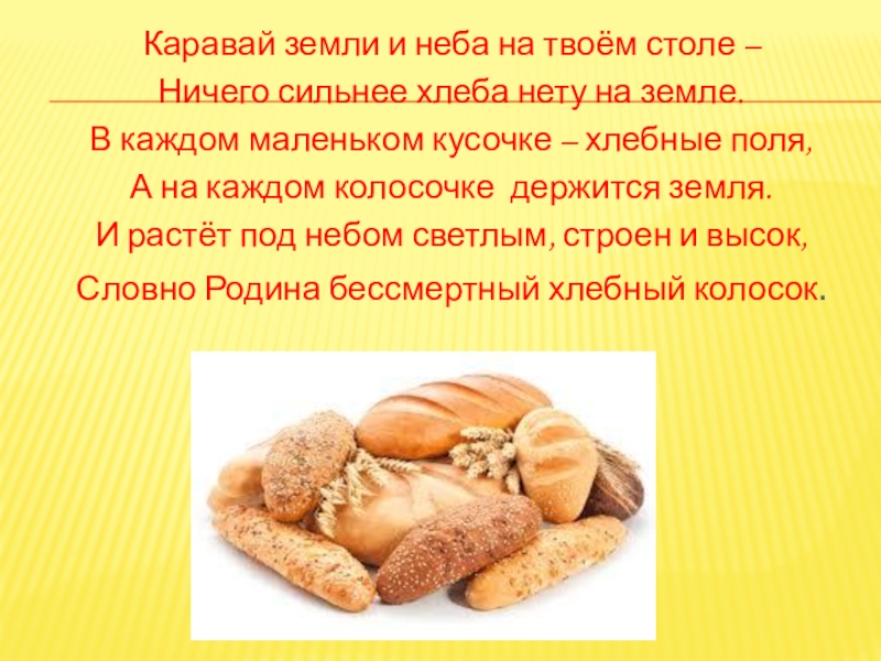 Каравай земли и неба на твоём столе – Ничего сильнее хлеба нету на земле. В каждом маленьком