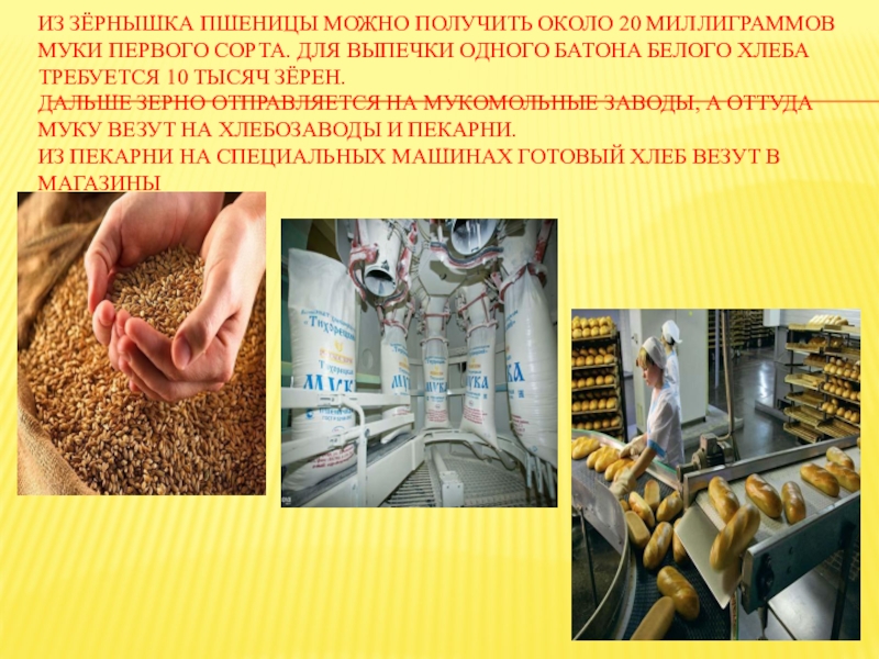 Для выпечки одного батона белого хлеба требуется 10 тысяч зёрен. Дальше зерно отправляется на мукомольные заводы, а оттуда муку везут на хлебозаводы и пекарни. Из пекарни на специальных машинах готовый хлеб везут в магазины