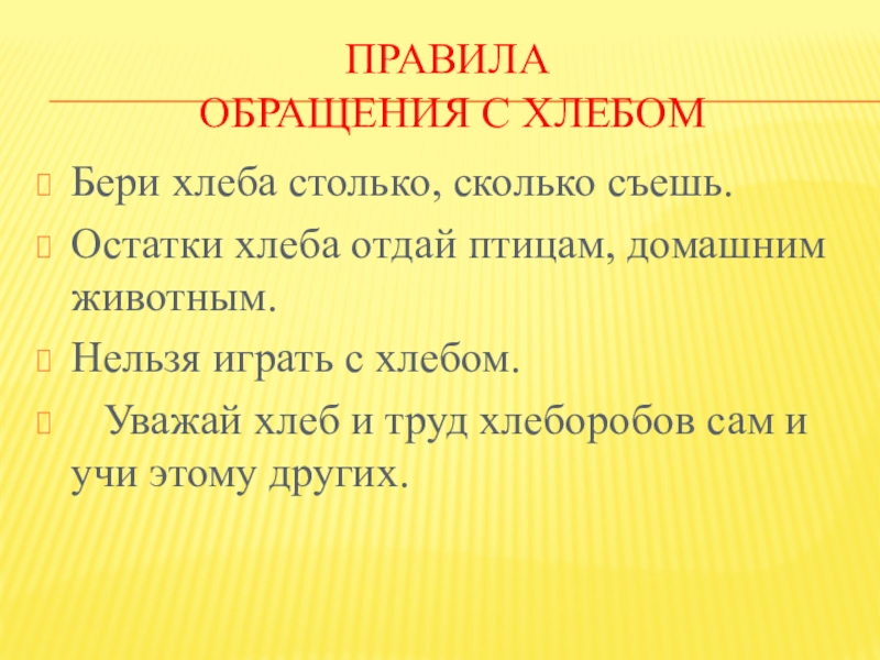 ПРАВИЛА  обращения с хлебомБери хлеба столько, сколько съешь.Остатки хлеба отдай птицам, домашним животным.Нельзя играть с хлебом.