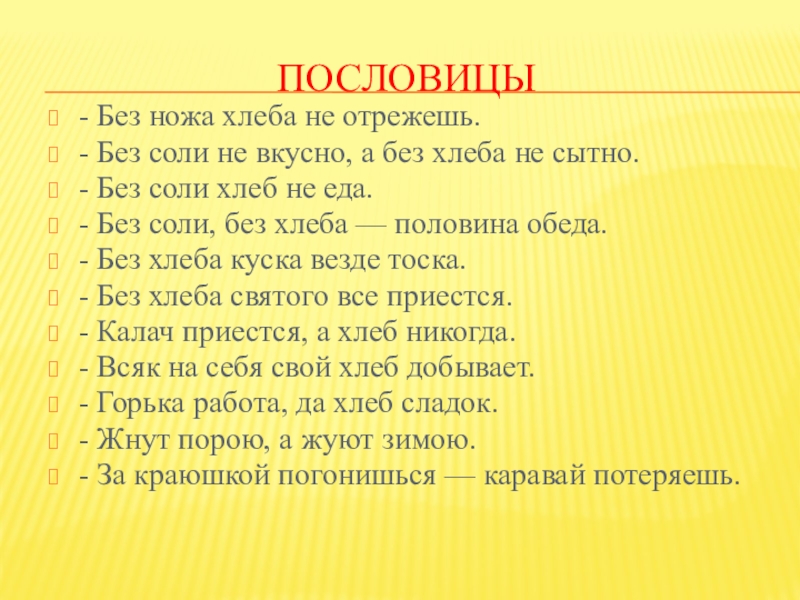 ПОСЛОВИЦЫ- Без ножа хлеба не отрежешь.- Без соли не вкусно, а без хлеба не сытно.- Без соли