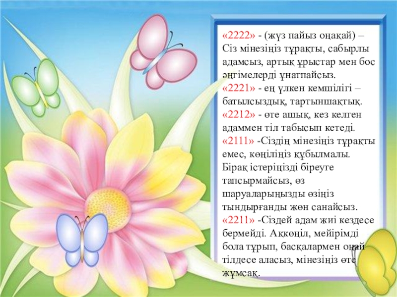 Слайд 7«2222» - (жүз пайыз оңақай) –Сіз мінезіңіз тұрақты, сабырлы адамсыз, артық