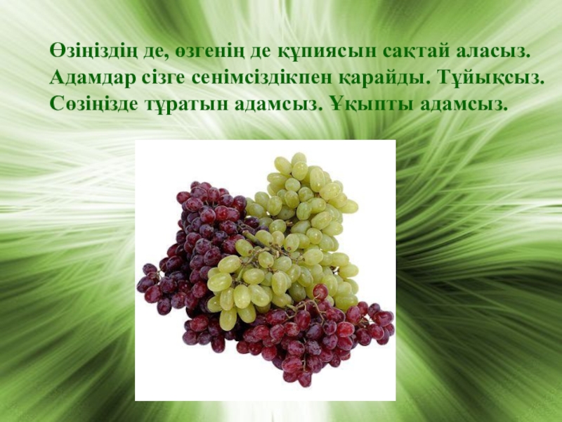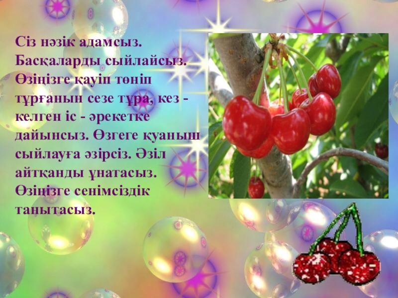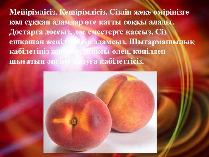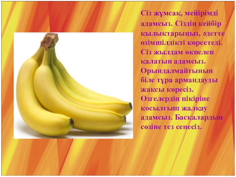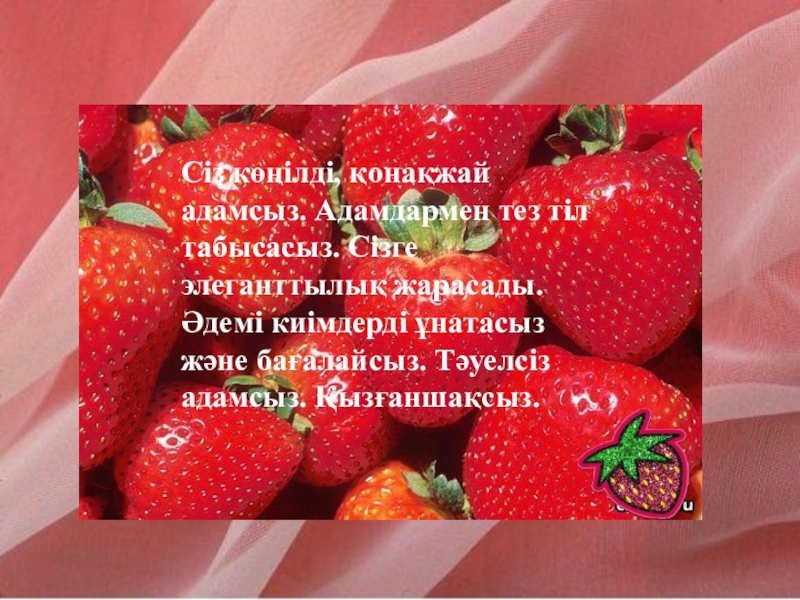 Слайд 18Сіз көңілді, қонақжай адамсыз. Адамдармен тез тіл табысасыз. Сізге элеганттылық жарасады.