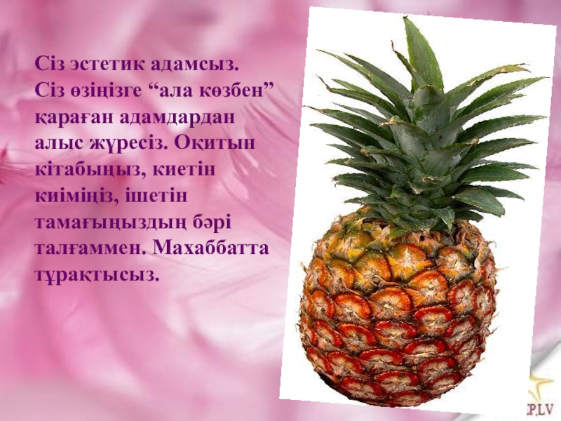 Слайд 22Сіз эстетик адамсыз. Сіз өзіңізге “ала көзбен” қараған адамдардан алыс жүресіз.