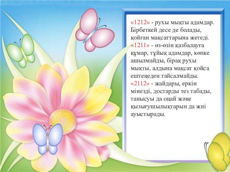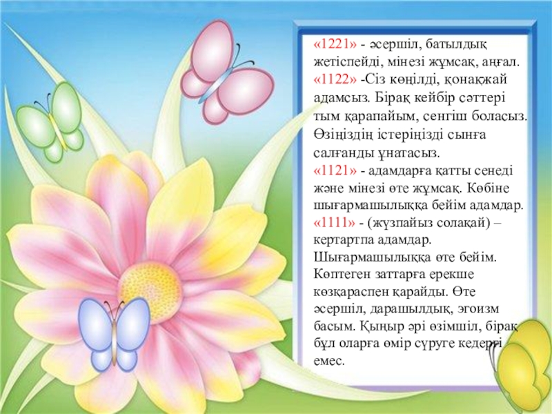 Слайд 9«1221» - әсершіл, батылдық жетіспейді, мінезі жұмсақ, аңғал.